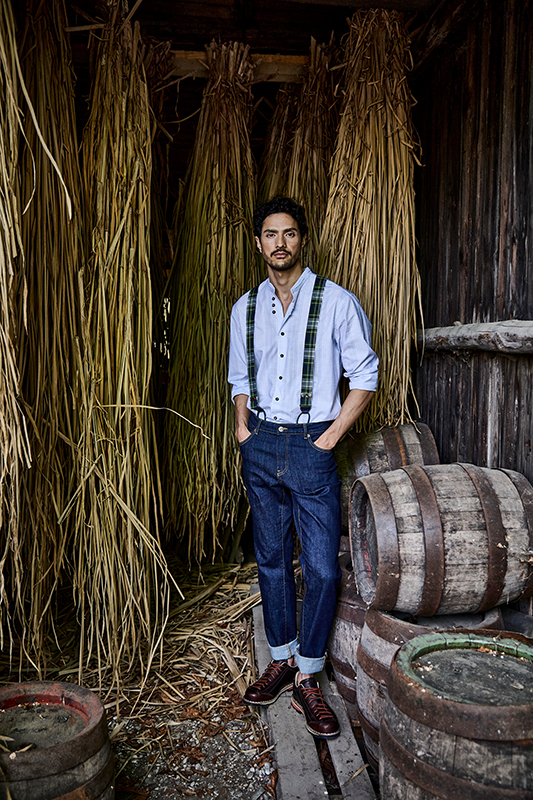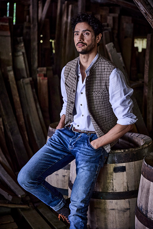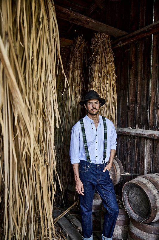 As relaxed and casual as a warm evening. The classic fine-striped shirt was given a modern interpretation and a few original details were added: the alpine stand-up collar looks good under a jacket and vest. The buttons are wood-colored and contrast with the light fabric. The top buttons can be closed or worn open with an elaborate loop. And when choosing colors, Mey & Edlich based their choice on the sky and clouds. The robust tartan suspenders are a casual break in style. And blue jeans always fit.
