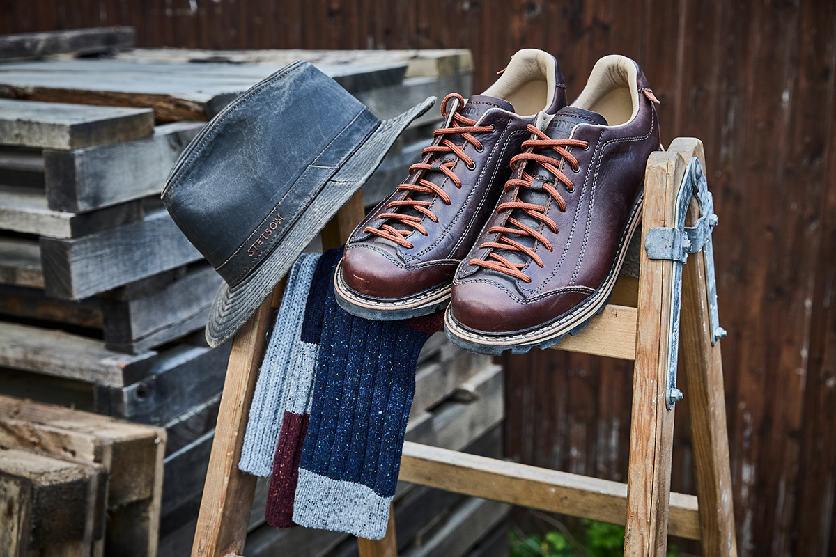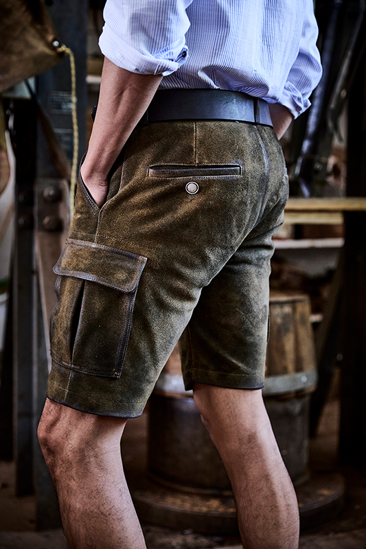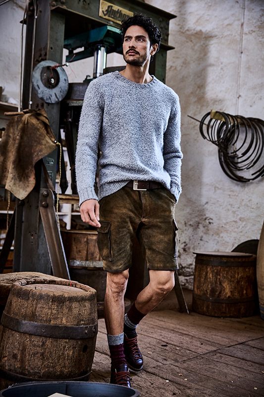 Here comes the leather bux for real guys. Without a bib or fuss, but with practical cargo pockets like modern shorts. In everything else, these trousers are in no way inferior to their traditional ancestors: extremely robust goat suede leather, side pockets and the back pockets with buttons. The handmade, antique color is timeless and looks as if the good piece has been cared for for a long time. The chunky knit sweater is casual and modern, and is also the perfect cozy companion for cool evenings. The high wool socks and the brown lace-up boots complete the outfit and underline the rustic character of the collection.