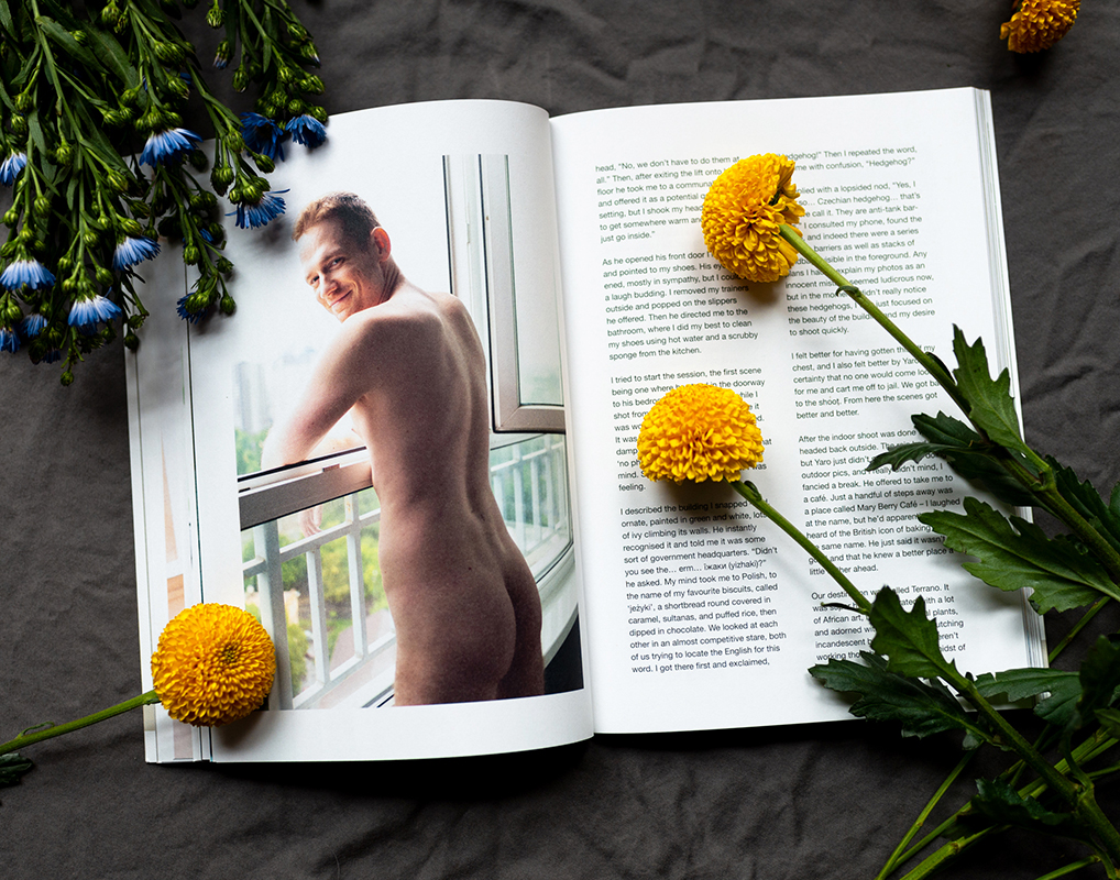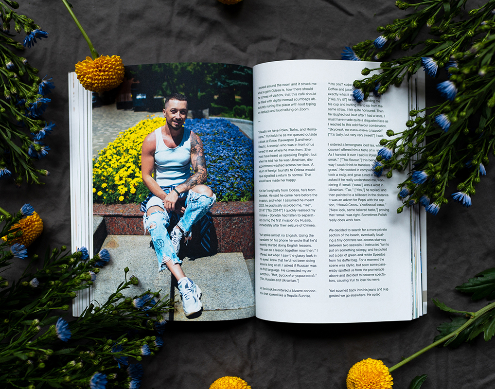 “Elska Odesa also marks the first in a brand new era of Elska,” continues Liam. “Previously, I used to plan each issue to the most minute of details. This time, mainly because of the war, I arrived spontaneously. I then just met whichever local men I happened to find, and photographed them where they wanted, when they wanted, and how they wanted. Then, after each meeting, I wrote extensive notes in a diary, which became the basis of the narrative in Elska Odesa. For future editions, I will follow this spontaneous spirit to meeting locals and will use this documentarian / diary approach to the writing.”