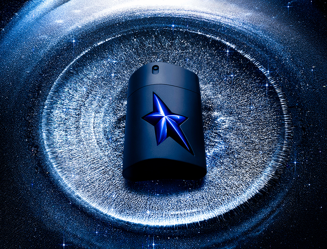 In 2025, a new iconic bottle embodies the glamorous aura of A*MEN STELLAR Eau de Parfum Lumineuse. Its flawlessly smooth midnight black is adorned with an electrifying star in multifaceted cobalt blue—a brilliant evolution of the cosmic color that has always represented Mugler.