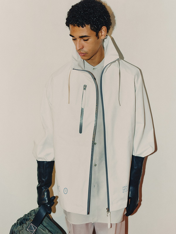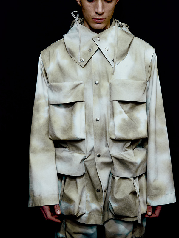 Through this lens, the collection’s intent is to elevate garments through both material and appearance: using superiorfabrics, trims, and technique to create products that last, and eliminating any superfluous design details. Tailoring issharp, with single visible buttons, in strong wool granité, double-faced sculptural cotton, and jacquard cotton-polyester houndstooth. The silhouette is full, or contracted with anatomically shaped port trousers, at times featuring waterproofperformance zippers. Outerwear is multi-pocketed, modular, voluminous, soft, and billowy, recalling military function.Bonded double-face printed viscose and 3-layer nylon is worked technically, and printed with softened cosmic motifs.Fluid fil-coupé and broderie anglaise adorned shirtings are cut generously, creating a soft silhouette against sturdyrecycled polyester drill trousers and structured coats.