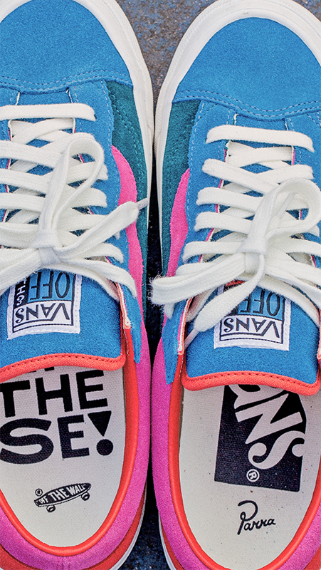 The style pairs soft suede with Parra’s signature wavy colorblocking and asymmetric details delivering a minimalist and polished look. Playful typography adds character across custom tongue labels and mismatched footbeds, punctuated with the reminder: “Don’t forget to skate in these.”