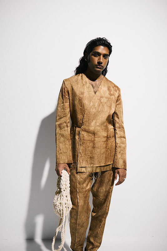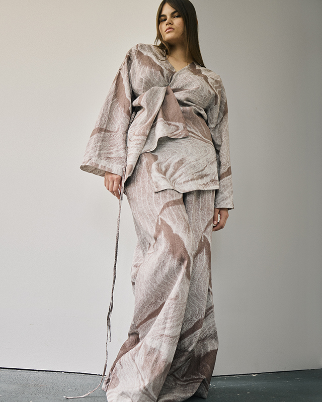 Deconstructed classic stripe patterns are hand screen-printed in our Berlin studio using eco-friendly Ökotex Standard 100 certified pigments. Softly dissolving prints, intuitive plant-dyed batik textiles in earthy brown and rose shades and wide and flowing silhou- ettes emphasize the concept of letting go of control.