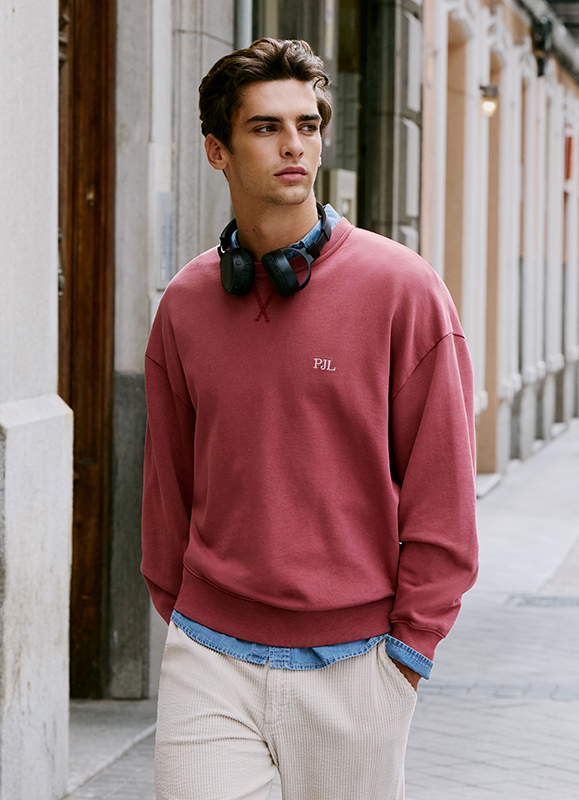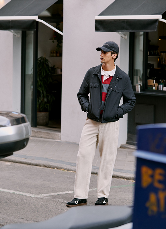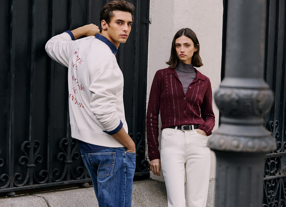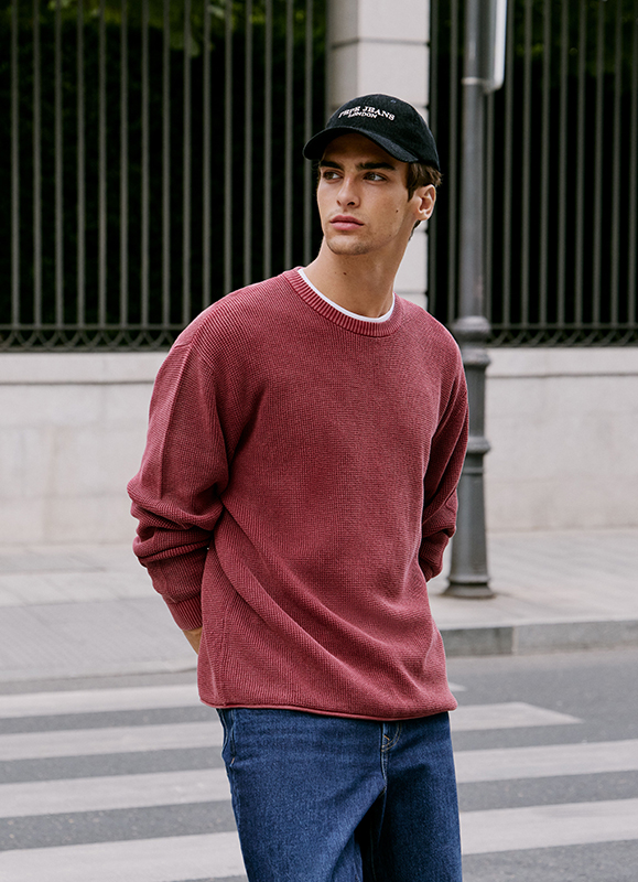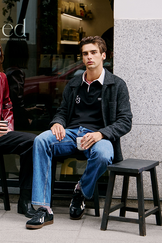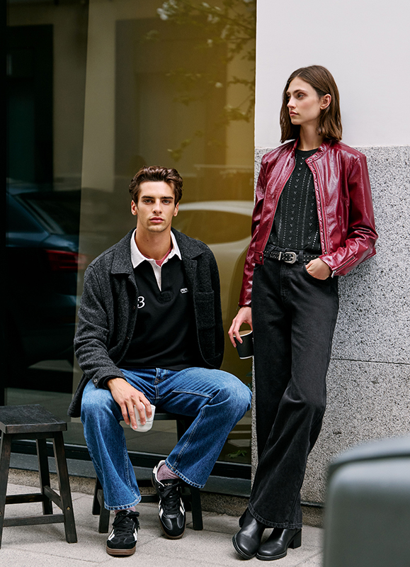The collection plays with iconic shapes, giving them a fresh twist. Classic knit sweaters in rich hues, clean-cut shirts with textured finishes, and relaxed-fit trousers combine to create outfits that feel intuitive. Denim becomes a second skin, sometimes in flowing lines, sometimes in sculptural modernity. Deep burgundy runs through many of the collection’s looks, lending them a powerful, distinctive presence. The rhythm of the city can be heard in every detail.