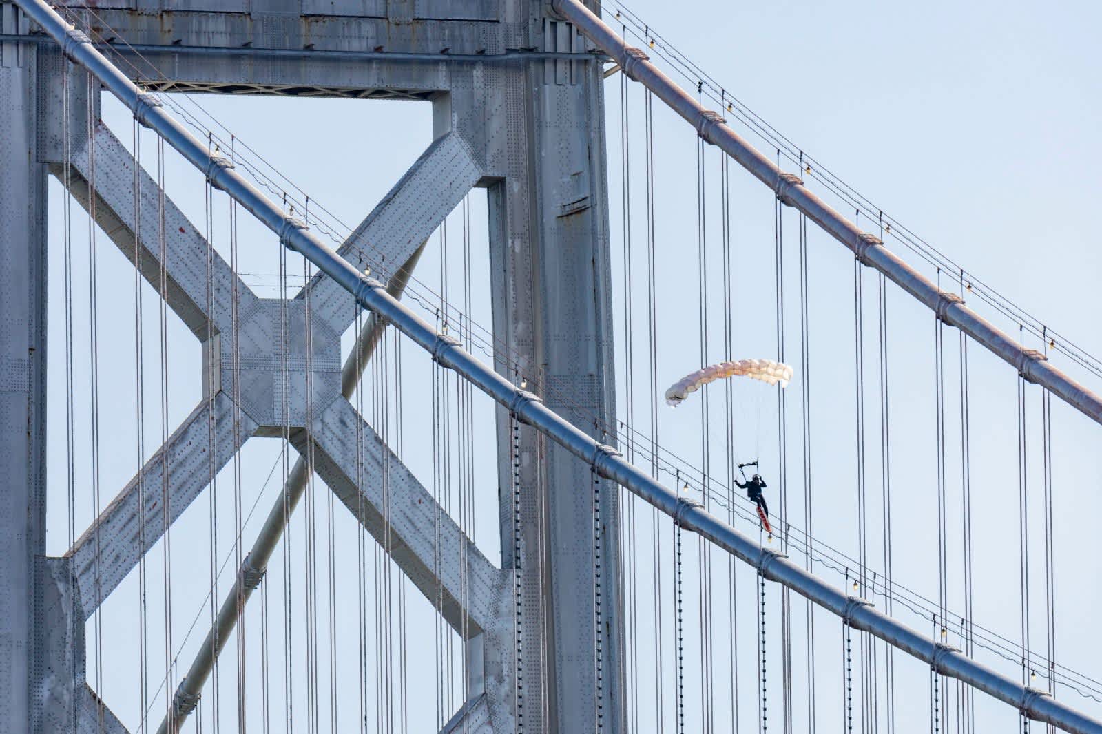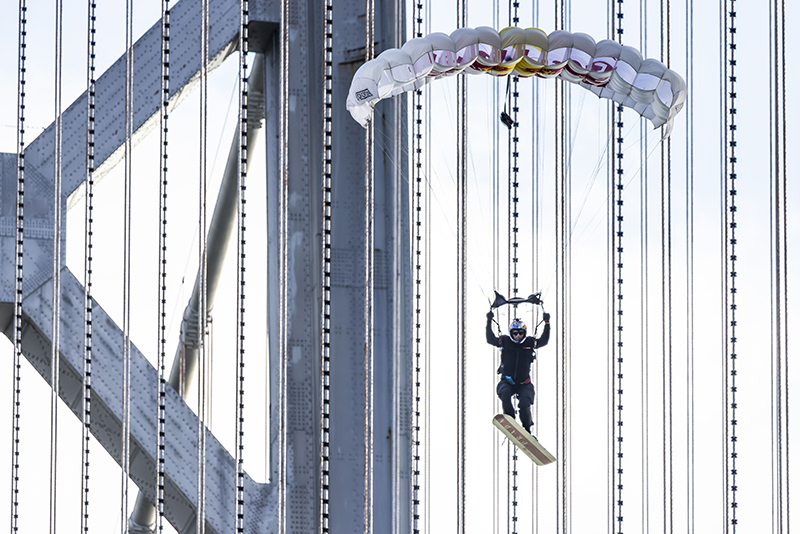 Prada Linea Rossa collaborated with Red Bull athlete, skysurfing pioneer, and two-time X Games medalist Sean MacCormac for his achievement of an unprecedented feat: he is the first person ever to skysurf onto the cables of the iconic San Francisco Bay Bridge, following a 1676.4 meter skydive.