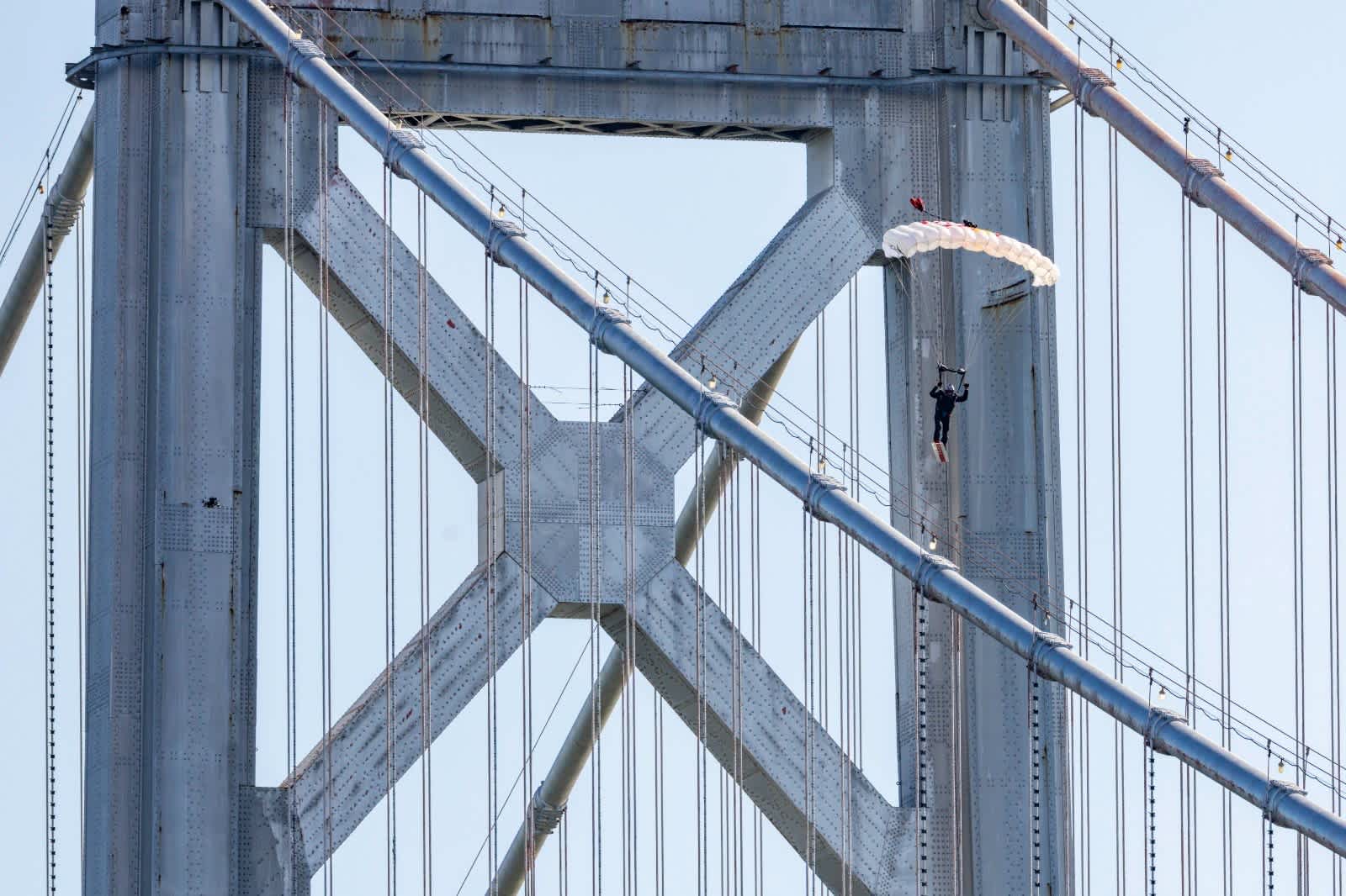 Fulfilling this lifelong dream required months of training and the development of cutting-edge technical equipment. MacCormac jumped from a helicopter above the bay in California strapped to an exclusive high-tech board, created as a collaboration between Prada Linea Rossa and the Luna Rossa team. Following a long skysurfing descent, he reached the bridge’s cables, sliding along them for several seconds before spiral turning and landing on a floating platform positioned below the structure.