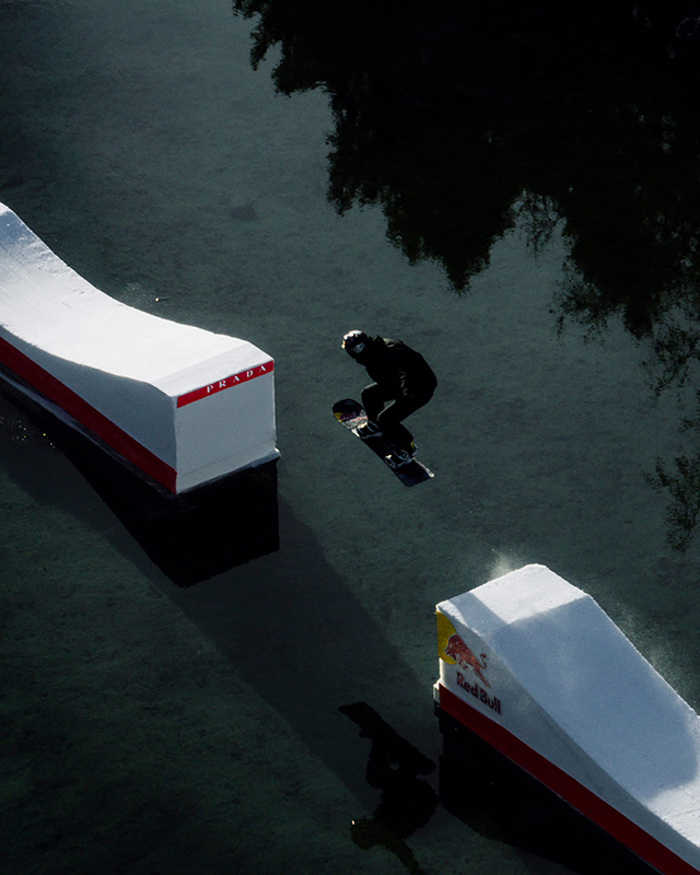 Inspired by the human body and the duality between the demands of movement and advanced textile development, Prada Linea Rossa equipped the athlete with clothing designed to meet the complexities of this challenge. Breathable, lightweight yet strong, heat-sealed as opposed to stitched, the garments provided feature Prada Extreme-Tex in two weights, offering antistatic, antibacterial, and thermoregulation properties via a unique graphene membrane. This fusion of design and performance allowed Vaultier to explore a new dimension of snowboarding and express all of his potential.