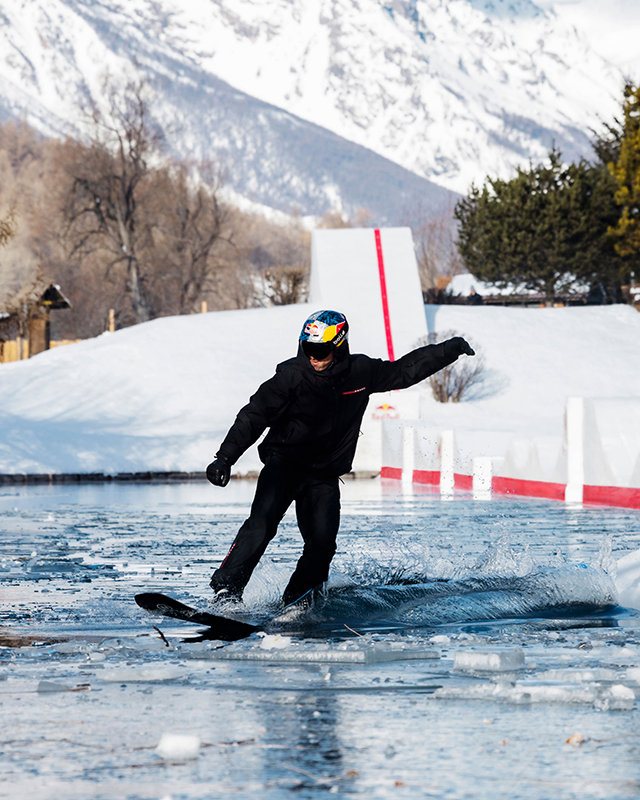 In the latest development of this ongoing partnership, double Olympic snowboarding champion Pierre Vaultier pushed his boundaries with a one-of-a-kind performance on a snow pump track built on a partially frozen lake in Serre-Chevalier, located in the French Alps.