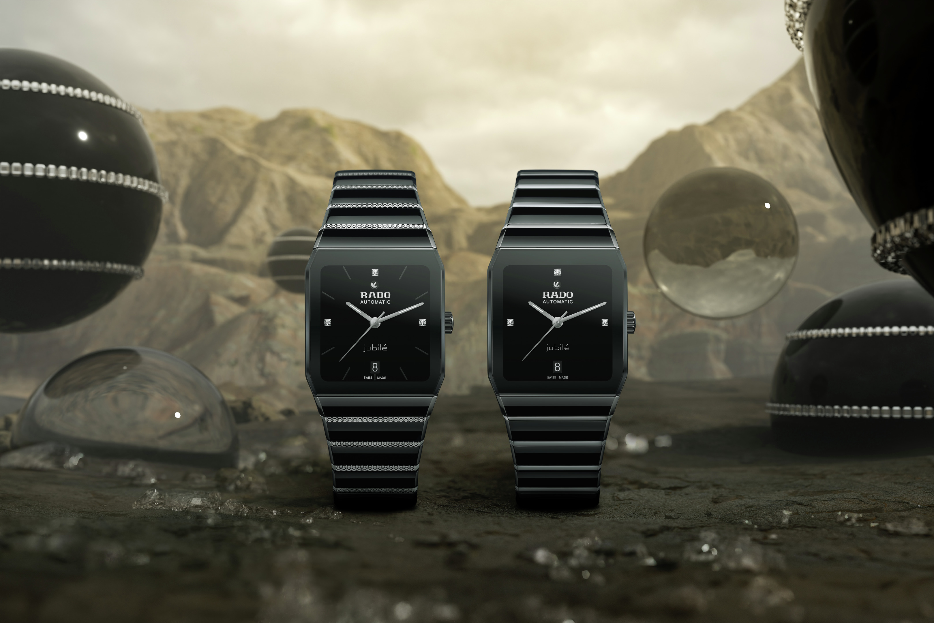 Diamonds bring extra design panache to two Rado Jubilé variants – both feature a polished black high- tech ceramic bezel and bracelet, a black ceramic crown, plus a black lacquered dial. The first features arguably the new range’s most minimalistic dial with three diamond indexes, at the 12, 3 and 9 positions. They are complemented by rhodium-coloured hands, on an otherwise all-black timepiece – a design that brings to mind glittering stars on the clearest of nights.
