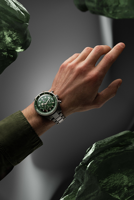 Its plasma high-tech ceramic sibling also features dual finishes on the bracelet, with polished plasma middle links flanked by matt components. Add in the stainless steel bezel, crown and pushers and the rhodium-coloured hands and indices, and it offers up an intriguing mix of metallic finishes. But it’s the bezel’s ceramic insert, in a dark, sumptuous green, with a polished finish, and a dial in a matching shade, that signals pure opulence.