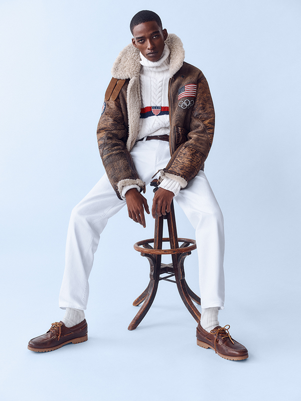 Both looks are completed with red, white and blue intarsia knit hats and mittens, a leather belt and brown suede alpine boots with spirited red laces. Each item in the uniforms is proudly manufactured in the United States.