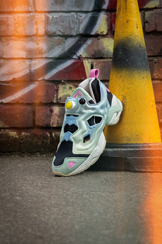Für den zweiten Teil der Kollaboration wurden die Designs des Classic Leather Pump 50thauf den Instapump Fury 50th übertragen. Diese Silhouette kommt mit Reeboks ikonischer „PUMP“-Technologie und dem gleichen Print auf dem Obermaterial wie der erste Drop. Den PUMP-Ball, den Fersenbereich und die Außensohle ziert das „Reebok x SMILEY® 50th Anniversary“-Logo mit Graffiti-Effekt.