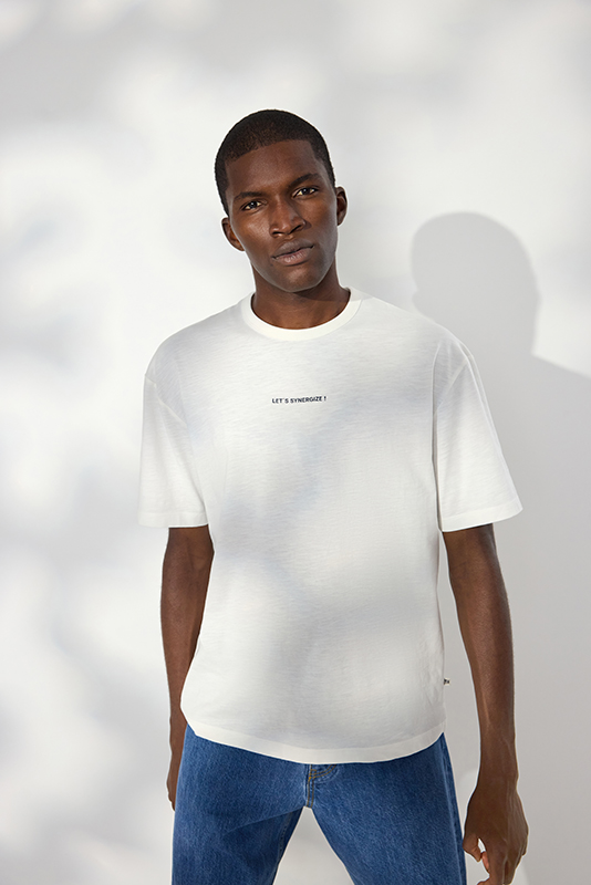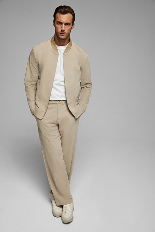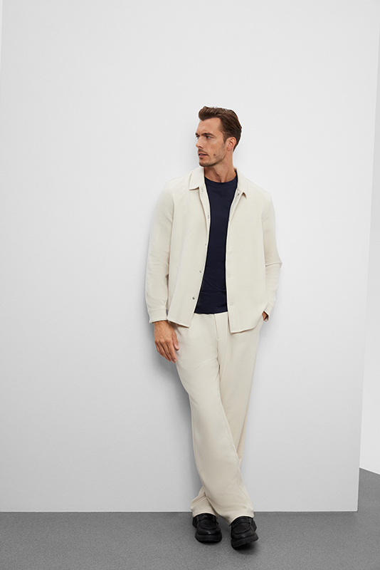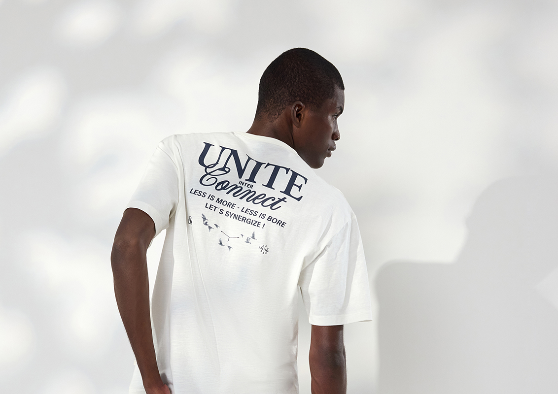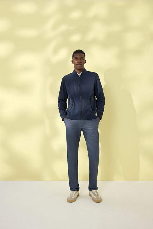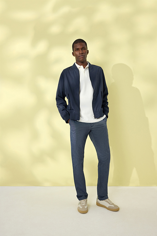 In March, Spring Feelings brings the fresh dynamism of spring into play. Sporty shirts and relaxed casual trousers take center stage, combining workwear details with laid-back looks. A harmonious color palette of navy, khaki, clear blue, and a soft rose tone lends these contemporary looks a modern touch. A college license with a striking artwork concept further develops the graphic theme from previous months.