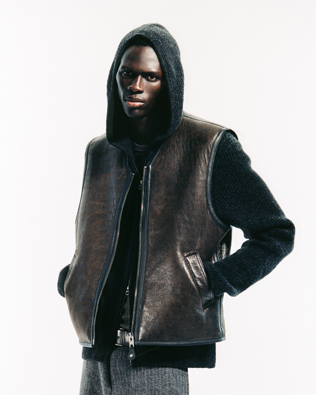 “We are very excited to collaborate with Schott NYC for this exclusive capsule. Bringing together their expertise in craftmanship and our vision of developing contemporary yet timeless silhouettes, I believe that we have created forever classics. When we were working on the silhouettes and details of these pieces, we envisioned where they would be worn. The high collar protects against wind, and the taped seams add both a functional and stylistic purpose, bringing the whole design together. Lastly, we decided to play with contrasting textures for the finish of the material, with a rougher look on the surface in opposition to the soft shearling on the inside of the vests and jackets.”