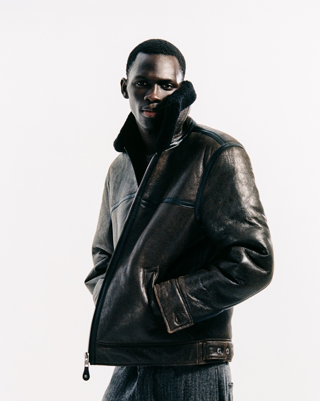 “We are very excited to collaborate with Schott NYC for this exclusive capsule. Bringing together their expertise in craftmanship and our vision of developing contemporary yet timeless silhouettes, I believe that we have created forever classics. When we were working on the silhouettes and details of these pieces, we envisioned where they would be worn. The high collar protects against wind, and the taped seams add both a functional and stylistic purpose, bringing the whole design together. Lastly, we decided to play with contrasting textures for the finish of the material, with a rougher look on the surface in opposition to the soft shearling on the inside of the vests and jackets.”
