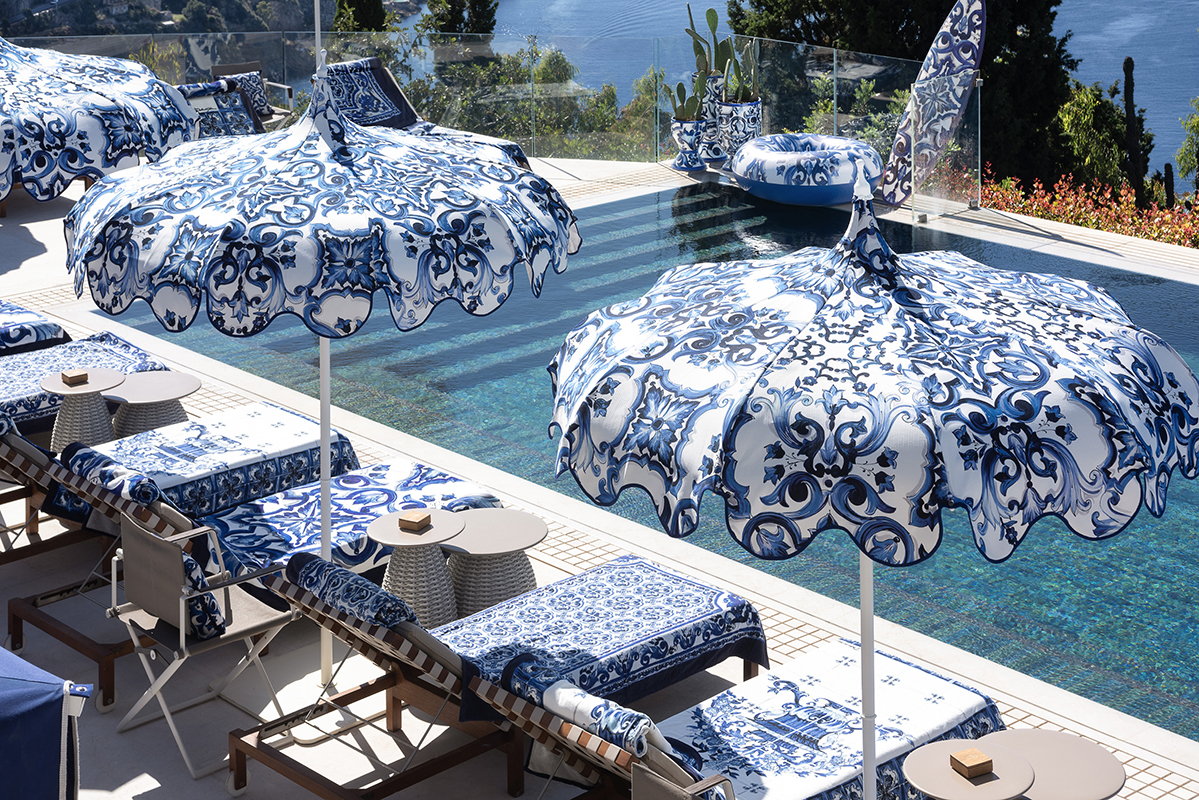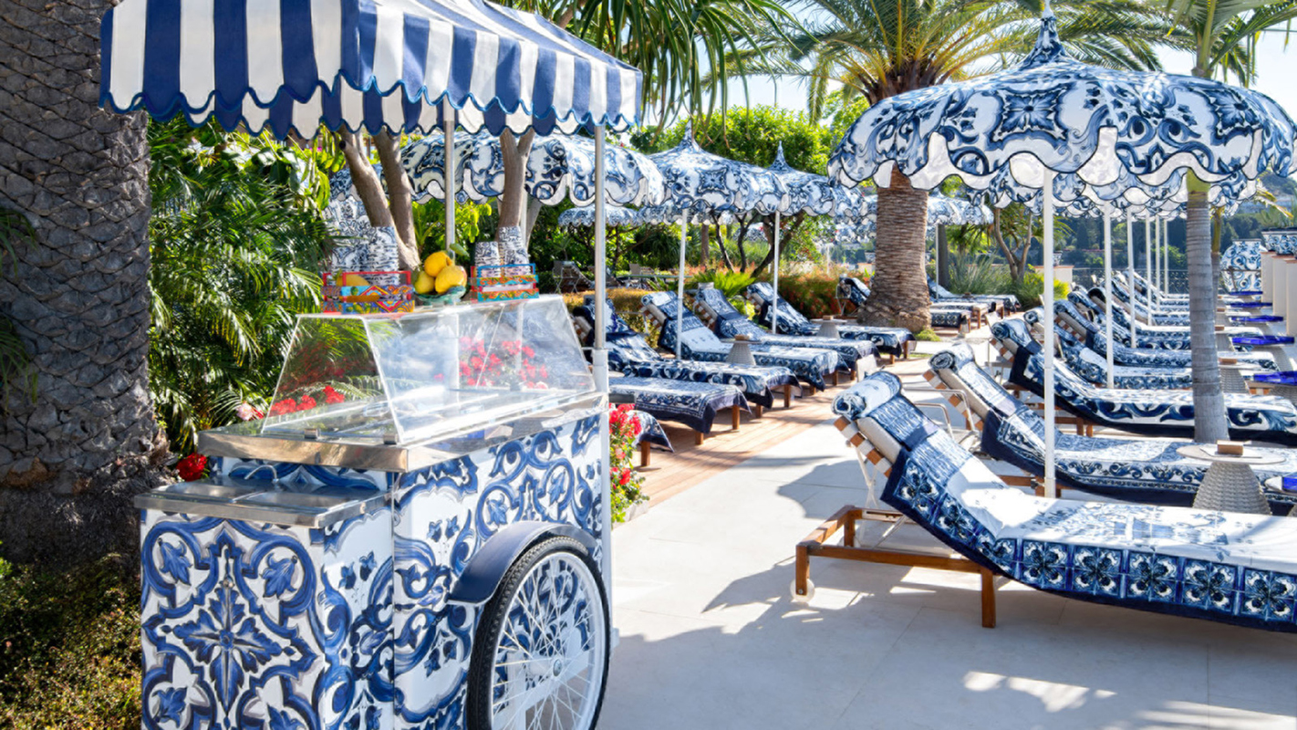 The San Domenico Palace, once a centuries-old monastery, is now one of Taormina’s most prestigious hotel addresses and an authentic testament to the town’s aristocratic past – a must-see for anyone seeking first-class hospitality in Sicily. Following the success of previous summer seasons, Dolce&Gabbana is adding further brilliance to the hotel with a Blu Mediterraneo design that adorns the entire sea-view infinity pool area and terrace. Inspired by the colors of the sea and the Mediterranean coast, this pattern evokes the freshness of Sicilian ceramics and celebrates the values of artisanal craftsmanship rooted in southern Italy.