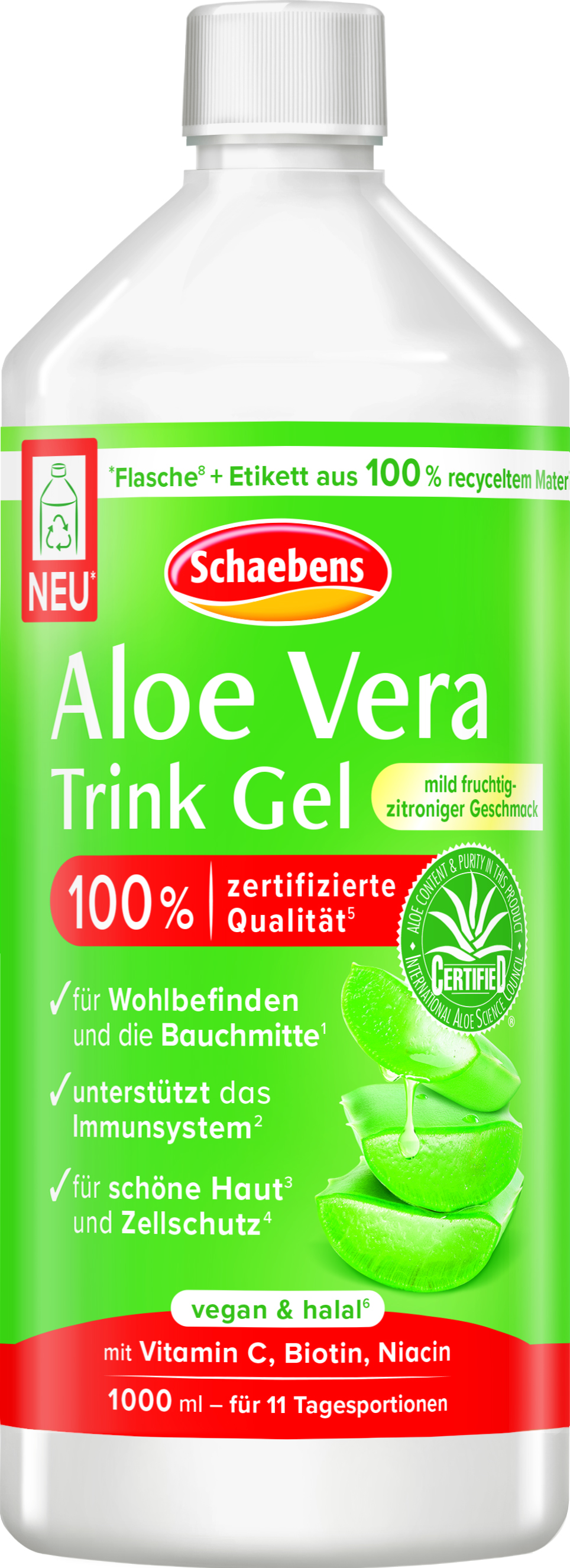 Mit Schaebens Aloe Vera Trink Gel ergänzen wir unsere Ernährung mit dem hochwertigen Aloe Vera Gel aus dem reinen Blattfilet sowie ausgewählten Vitaminen: C, Biotin und Niacin.