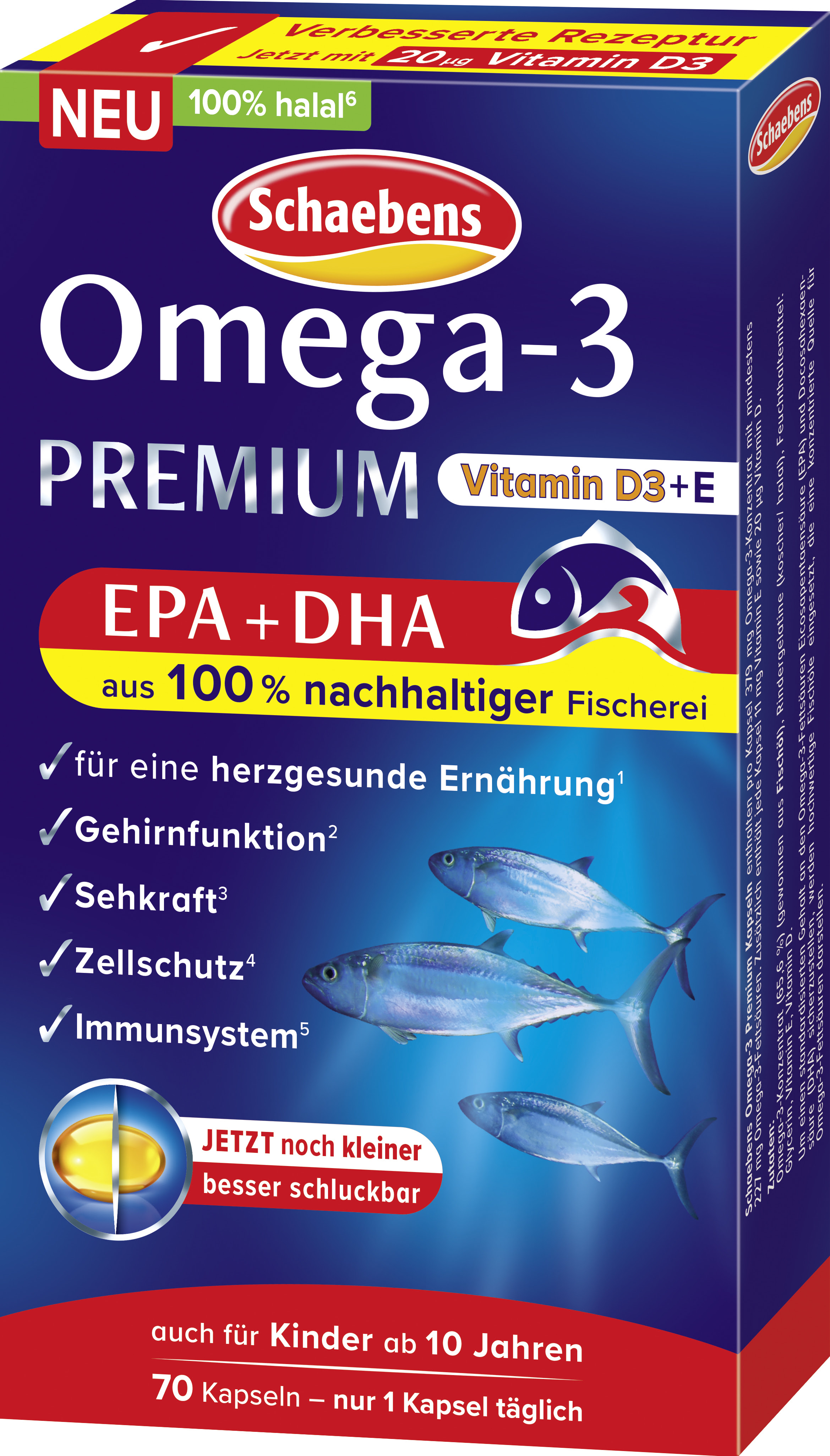 Schaebens Omega-3 Premium Softgel-Kapseln enthalten die vornehmlich in Kaltwasserfischen vorkommende Eicosapentaensäure (EPA) und Docosahexaensäure (DHA). Durch die moderne westliche Ernährung bildet der Körper häufig selbst nur in geringen Mengen EPA und DHA. Eine zusätzliche Zufuhr der Fettsäuren kann daher durchaus sinnvoll sein.