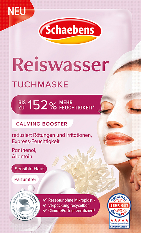 Die Schaebens Reiswasser Tuchmaske ist ein echter „Calming Booster“, der speziell für sensible Haut entwickelt wurde. Die leistungsstarke Formel mit Kaktusfeigen-Extrakt spendet sofort intensiv Feuchtigkeit und wirkt so einem Feuchtigkeitsverlust der Haut entgegen. Zudem reduziert sie bei regelmäßiger Anwendung Rötungen und Irritationen – für ein beruhigtes und ausgeglichenes Hautbild. Angereichert mit wertvollem Reiswasser, Panthenol und Allantoin bietet diese parfumfreie Formulierung eine sanfte, aber wirksame Pflege, die sensible Haut intensiv mit Feuchtigkeit versorgt und die natürliche Hautbarriere unterstützt.