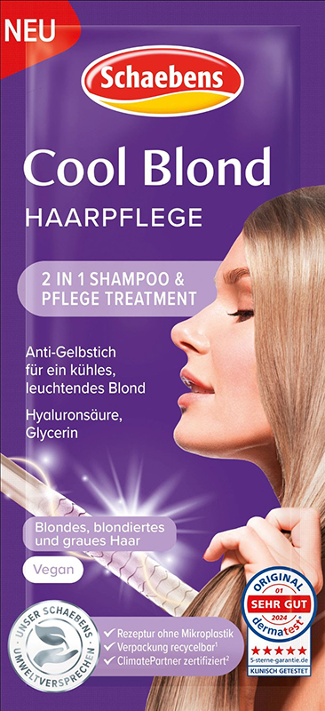 Das Schaebens Cool Blond 2in1 Shampoo und Pflege Treatment reinigt und pflegt die Haare intensiv und lässt Blondtöne strahlen. Die spezielle Pflegeformel mit Lila-Pigmenten neutralisiert ungewünschte Gelbtöne im Haar und schenkt ein kühles, leuchtendes Blond.