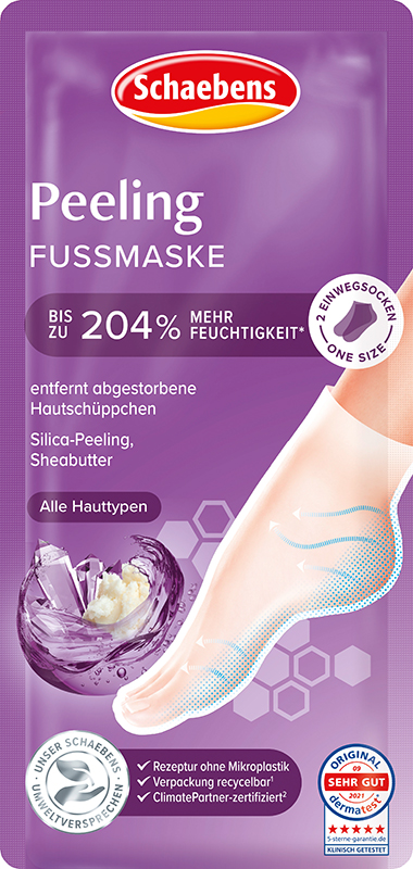 Die Schaebens Peeling Fussmaske mit Niacinamid und Sheabutter pflegt die Haut intensiv und spendet mehr Feuchtigkeit. Natürliches Silica-Peeling entfernt dabei schonend abgestorbene Hautschüppchen und sorgt für streichelzarte Haut. Die peelende und gleichzeitig pflegende Formulierung reduziert Spannungsgefühle, sodass sich trockene und raue Füße wieder weich und geschmeidig anfühlen. Für perfekt gepflegte und entspannte Füße.