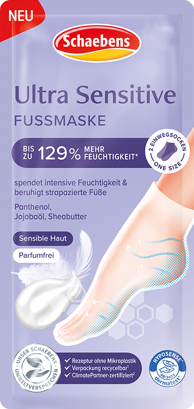 Calm your feet! Die Schaebens Ultra Sensitive Fußmaske mit Panthenol, Jojobaöl und Sheabutter ist die sanfte Pflege für sensible Füße. Die parfümfreie Rezeptur spendet langanhaltende Feuchtigkeit und beruhigt strapazierte Füße. Ideal geeignet für empfindliche Haut, sorgt die Maske für gepflegte und samtweiche Füße.