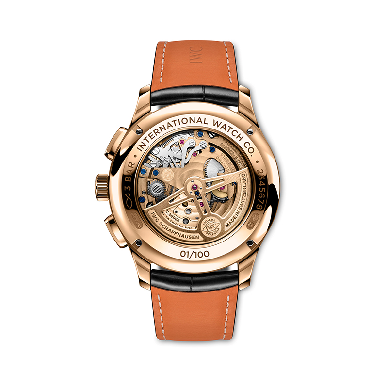 The Portugieser Tourbillon Rétrograde Chronograph is powered by the IWC-manufactured caliber 89900, a highly complex automatic movement with a total of 375 individual parts. The movement, elaborately finished with Côtes de Genève and perlage, can be viewed through the sapphire crystal case back. The rotor of the automatic winding movement is made of solid gold.