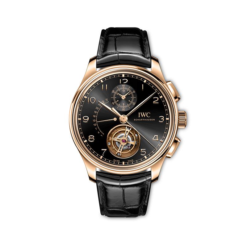Limited to 100 pieces, the Portugieser Tourbillon Rétrograde Chronograph (Ref. IW394009) features a case, pushers, and crown artfully crafted from 18-carat Armor Gold®. Thanks to an improved microstructure, this material boasts significantly higher hardness values than conventional gold alloys. The obsidian-colored dial is produced using a complex process comprising 60 individual steps. Fifteen layers of clear varnish give it exceptional optical depth and an almost three-dimensional effect. Gold-plated hands and solid gold appliqués complete the dial design. The watch is fitted with a black alligator leather strap from Italian leather manufacturer Santoni, secured with an 18-karat Armor Gold® folding clasp.