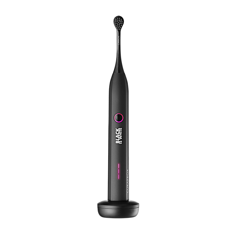 Die Schallzahnbürste «Black is white»-Hydrosonic beeindruckt durch ihr mattschwarzes Auftreten. Schwarz sind auch die Bürstenköpfe, die mit Aktivkohle-Partikeln ausgestattet sind und damit sanft Zahnverfärbungen entfernen. Die Schallzahnbürste «Black is white»-Hydrosonic bringt Mundgesundheit und Schönheit zusammen, verbunden mit Design und Funktionalität. Mit bis zu 84.000 Reinigungsbewegungen in drei Stufen entfernt sie Biofilm und Verfärbungen und ist dabei doch super sanft. Die Curen®-Filamente der «Black is white»–Bürstenköpfe sind mit Aktivkohle-Partikeln versehen. Sie entfernen Verfärbungen, ohne den Zahnschmelz zu beeinträchtigen und sind dabei sanft mit Stil. Die Bürstenköpfe sind außen lang und innen kurz in Tropfendorm angeordnet, damit sich jeder Zahn einzeln umfassen lässt. Der Akku ist so stark wie die Hydrosonic sanft und die Leistung bleibt gleich, egal wie stark der Akku geladen ist.