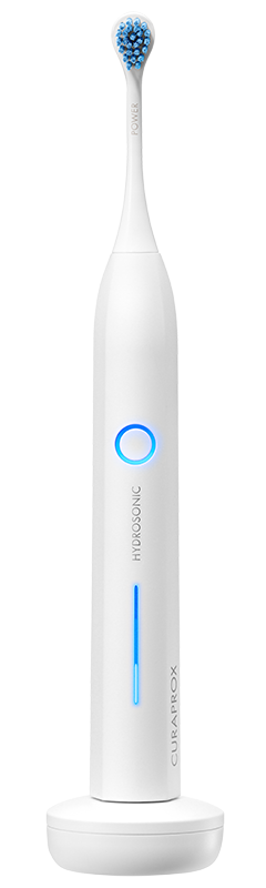 Die Schallzahnbürste „Hydrosonic pro“ von Curaprox ist entwickelt zur hochprofessionellen Unterstützung der Mundgesundheit: präventiv und zur Spezialpflege bei Spangen, Implantanten und zur Pflege des Sulcus, zur Therapie und Vorbeugung von Gingivitis und Parodontitis. Dabei ist sie ganz einfach zu bedienen: Ein Knopf für alle Funktionen, dazu blau leuchtende LEDs zur Funktionsanzeige. 44.000 – 84.000 Reinigungsbewegungen pro Minute, einstellbar in sieben Stufen – für eine wunderbar schonende und dennoch kraftvolle Reinigung. Der Clou liegt in der innovativen Schweizer Bürstenkopf- Technologie: Die Tropfenform umfasst jeden Zahn einzeln, effiziente Curen®- Filamente reinigen wirksam und sanft. Die drei verschiedenen Bürstenköpfe der Hydrosonic pro „power“, „sensitive“ und „single“ erreichen dank Curacurve®- Knick alle kritischen Stellen ganz leicht. Dabei sorgt die Schalltechnologie der Hydrosonic pro für doppelte Putzleistung: mechanisch und hydrodynamisch.