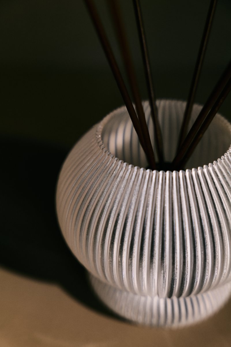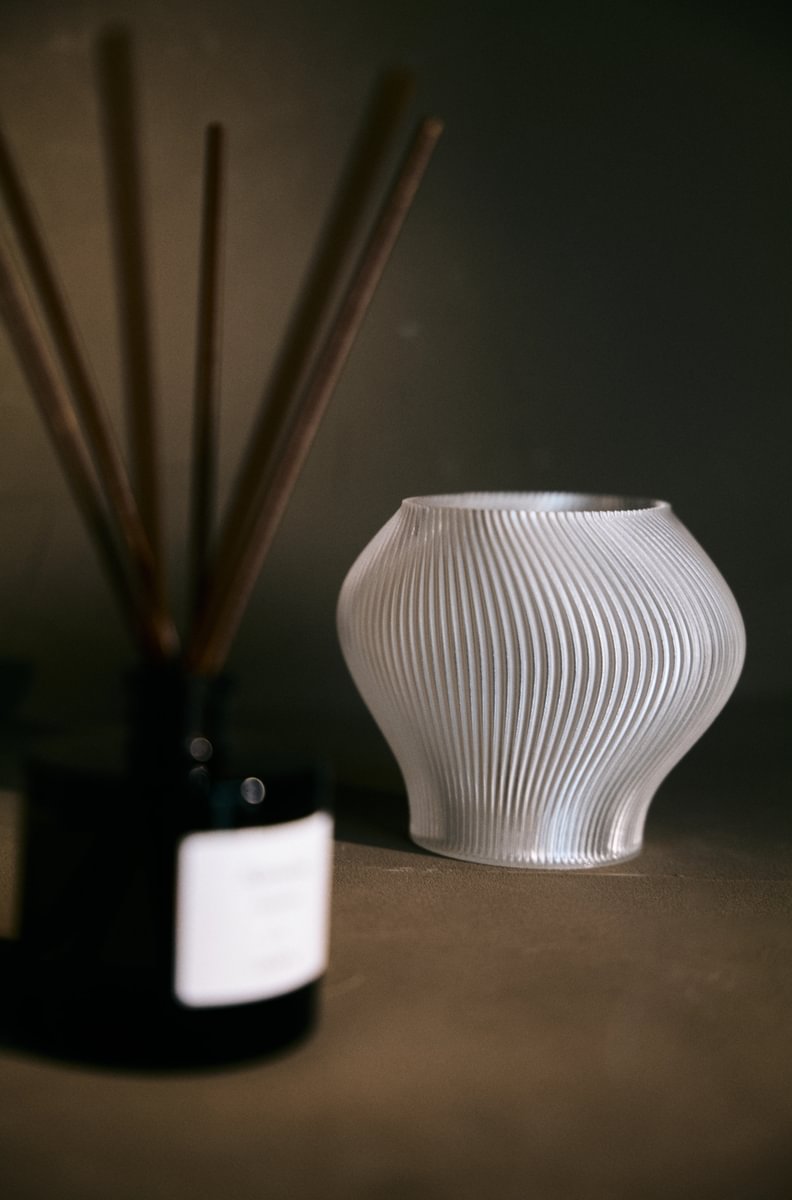 Gefäße für die großen Duftkerzen und Duftstäbchen von Looops – in zwei Formen, zwei Stimmungen. Entworfen im Wiener Designstudio Sheyn von Nicolas Gold und Markus Schaffer. Im 3D-Druck gefertigt aus nachhaltiger Maisstärke – klar in der Form, bleibend in der Wirkung.