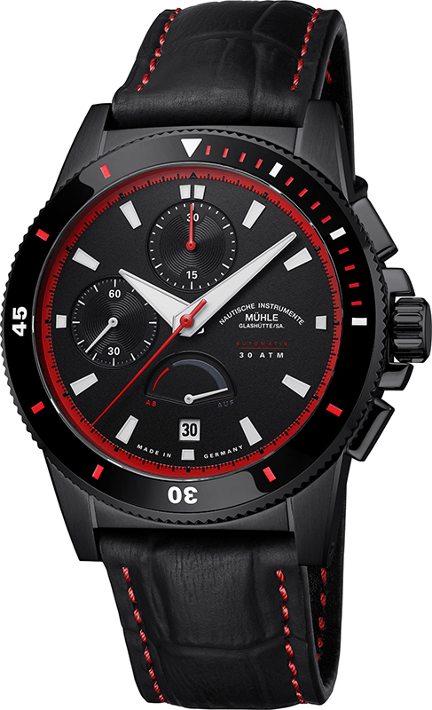 The high-quality stainless steel housing is also very robust and embodies strength through its striking black IP coating (Ion Plating), in which titanium or a titanium alloy is applied to the housing using an ion beam. There is also a double anti-reflective sapphire crystal with a thickness of 2.2 millimeters and an equally scratch-resistant ceramic inlay for the bezel that can be rotated on both sides. The 42.5 millimeter case is also suitable for outdoor use thanks to its screw-down crown including side protection and high water resistance of up to 30 bar. The new Sportivo Power Chronograph First Edition is held on the arm by a waterproof leather strap with an alligator grain and red contrasting stitching. This is also provided with a rubber layer.