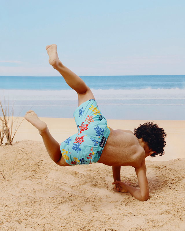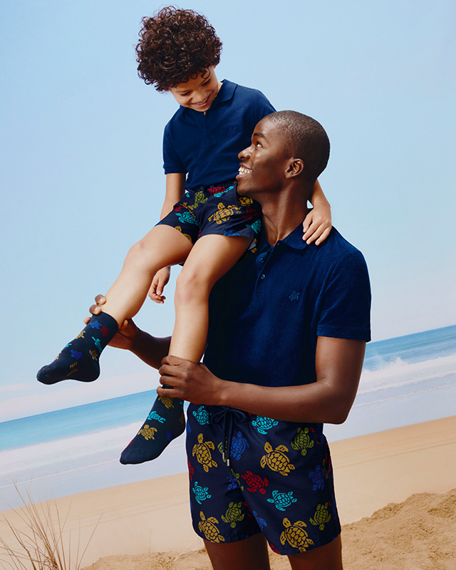The secret to vacation chic? Wearing matching suits and socks, of course! The original Saint-Tropez swimwear tailor completes the look with a playful “Turtle Knit” father-son swim trunk honoring Falke’s unique knitting heritage.