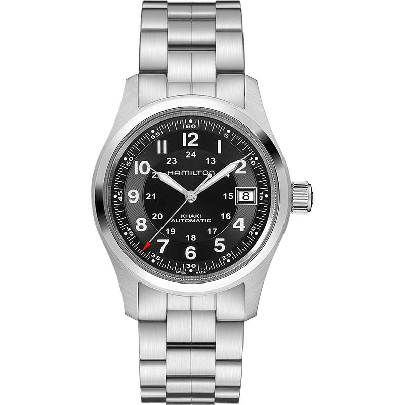 The Hamilton Khaki Field Automatic is equally at home on hiking trails, Alpine peaks, or city streets, and presents itself in the classic style of an outdoor watch. With an 80-hour power reserve, it is a reliable companion for any adventure. With its sleek design and proven materials, the Khaki Field Automatic is the ideal companion for all types of activities—from trail running and hiking to alpine adventures.