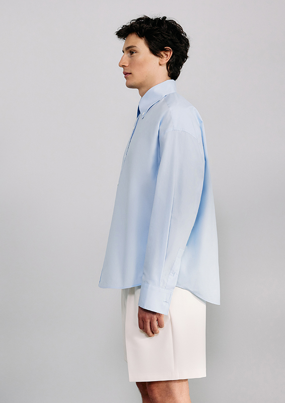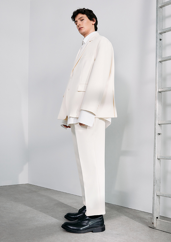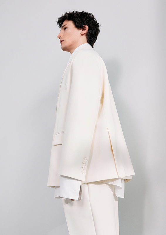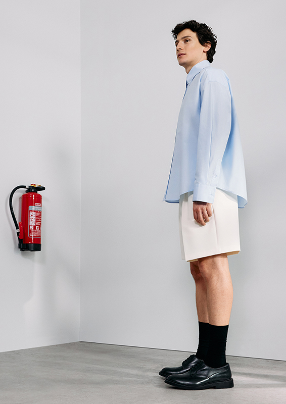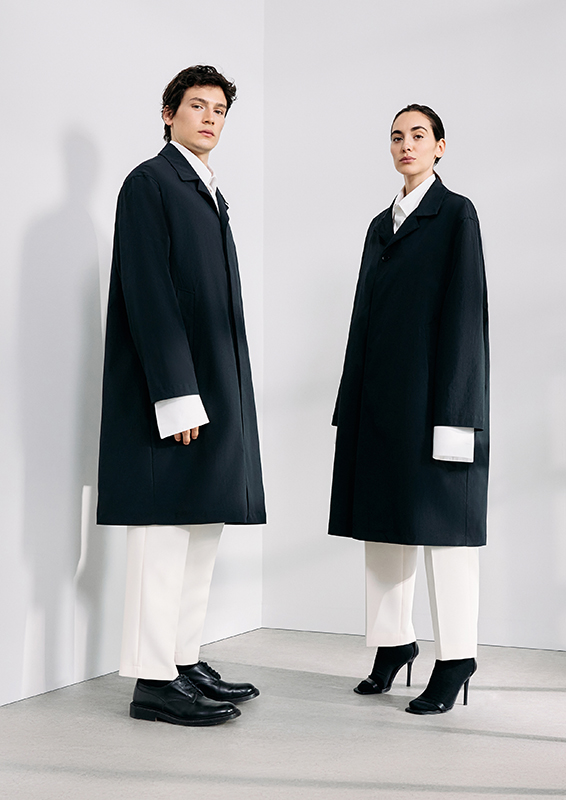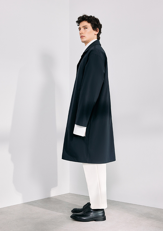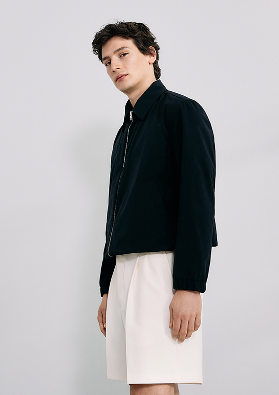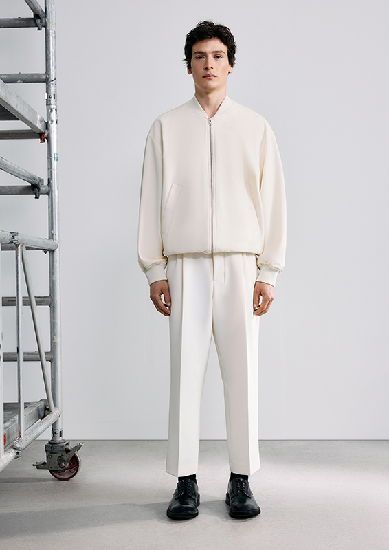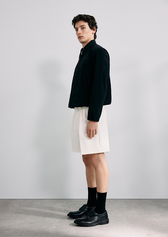 When sartorial codes meet urban functionality, new proportions emerge. New blousons, deconstructed blazers, coat styles, and bomber jackets create visual density. Volumes and lengths shift perspectives and generate dynamism. Highlights include wide-leg suit pants, cropped chinos, shorts, and classic five-pocket pieces. The fabrics used—from technical cotton and poplin to wool, recycled polyester, nylon, and suede—underscore the clean lines. Blue and grey denim blends seamlessly.