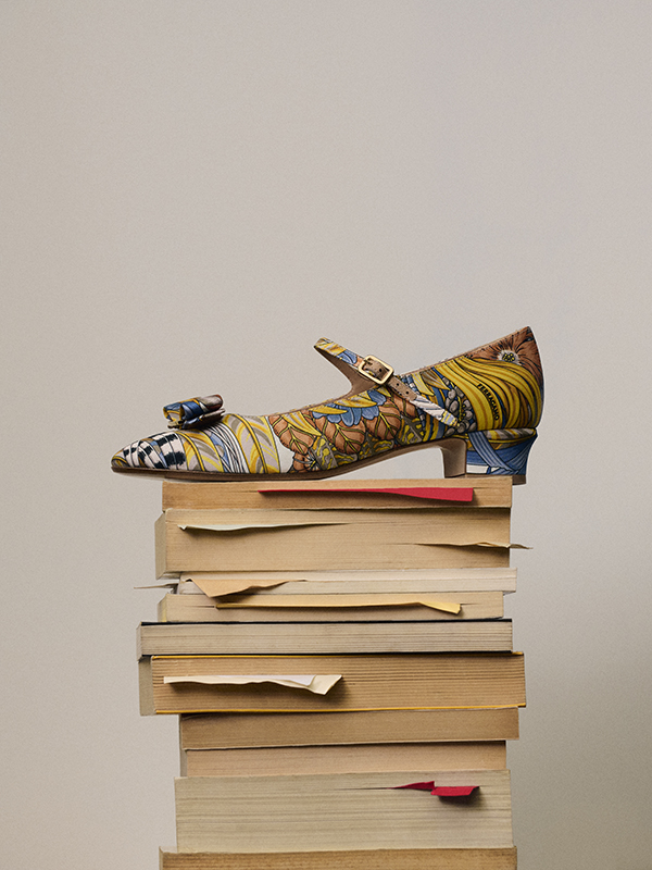 As for the footwear, a Mary Jane with a sculpted heel and Vara bow features a multicolored floral print in shades of blue, red, white, and black.
