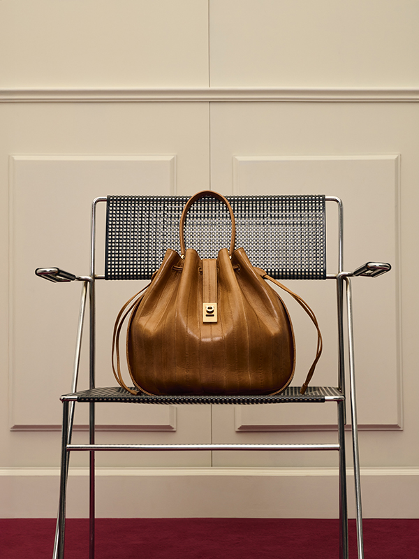 Leading the selection is the Hug Bag in burgundy, or in black with a red interior, alongside the Soft Hug in blue with a black interior. The bag selection also includes a natural bucket bag in leather, secured with a Hug buckle.