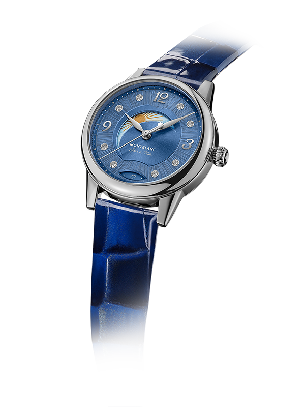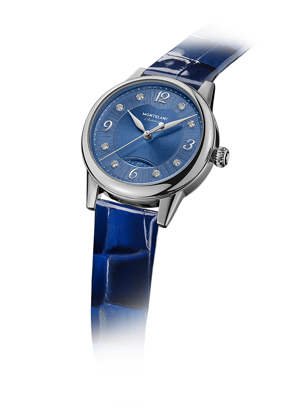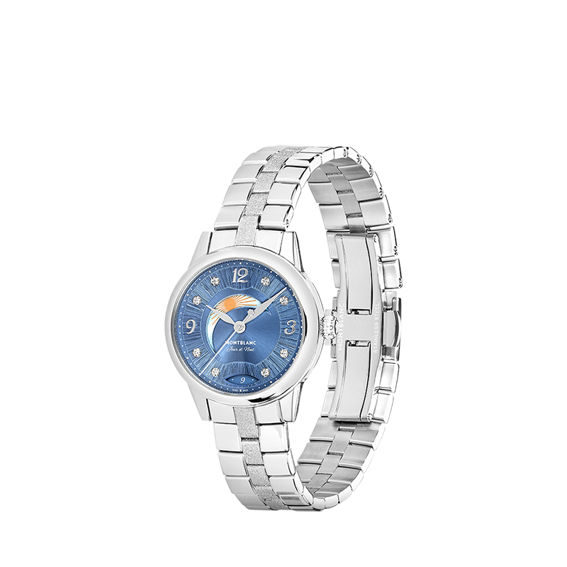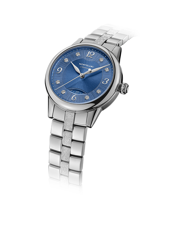 Montblanc’s Bohème Collection presents the codes of watchmaking in an elegantly feminine way, featuring three new models – a 30 mm Automatic Date and two new Day & Night models in 30 mm and 34 mm – in a new, deep blue hue. Following last year’s models with silver-white dials, these new blue creations feature delicate details inspired by handwriting and watercolor painting. They also feature a new interchangeable stainless steel bracelet with a textured center link and a micro-adjustment system.