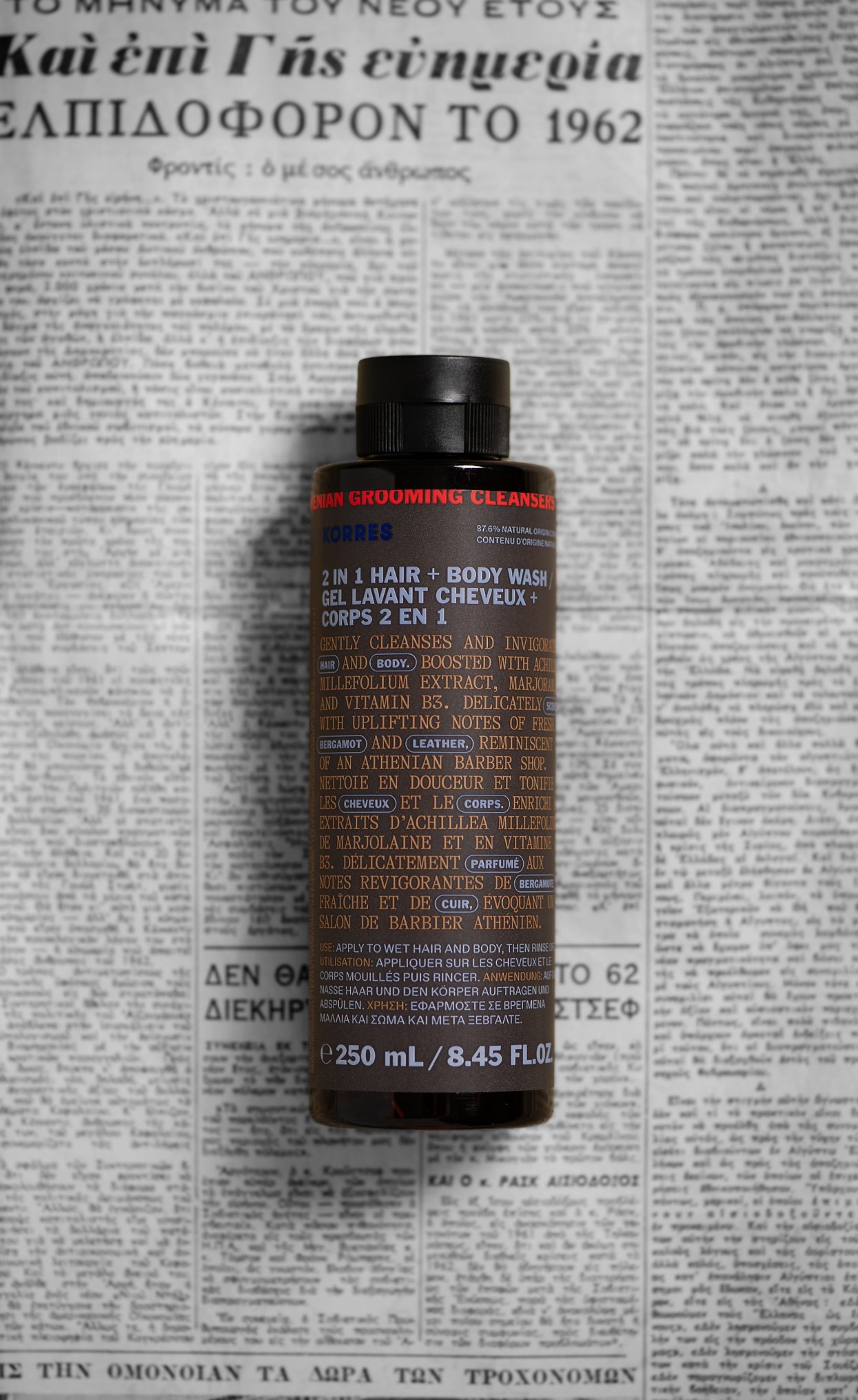 This 2-in-1 shampoo and shower gel has been specially developed to gently cleanse and refresh both hair and skin. Enriched with yarrow and marjoram extracts as well as vitamin B3, it provides invigorating care. The scent of fresh bergamot and leather is reminiscent of the classic atmosphere of an Athens barbershop and adds a refreshing touch to the daily care routine. With 87.6% ingredients of natural origin, it is the perfect choice for gentle yet thorough cleaning.