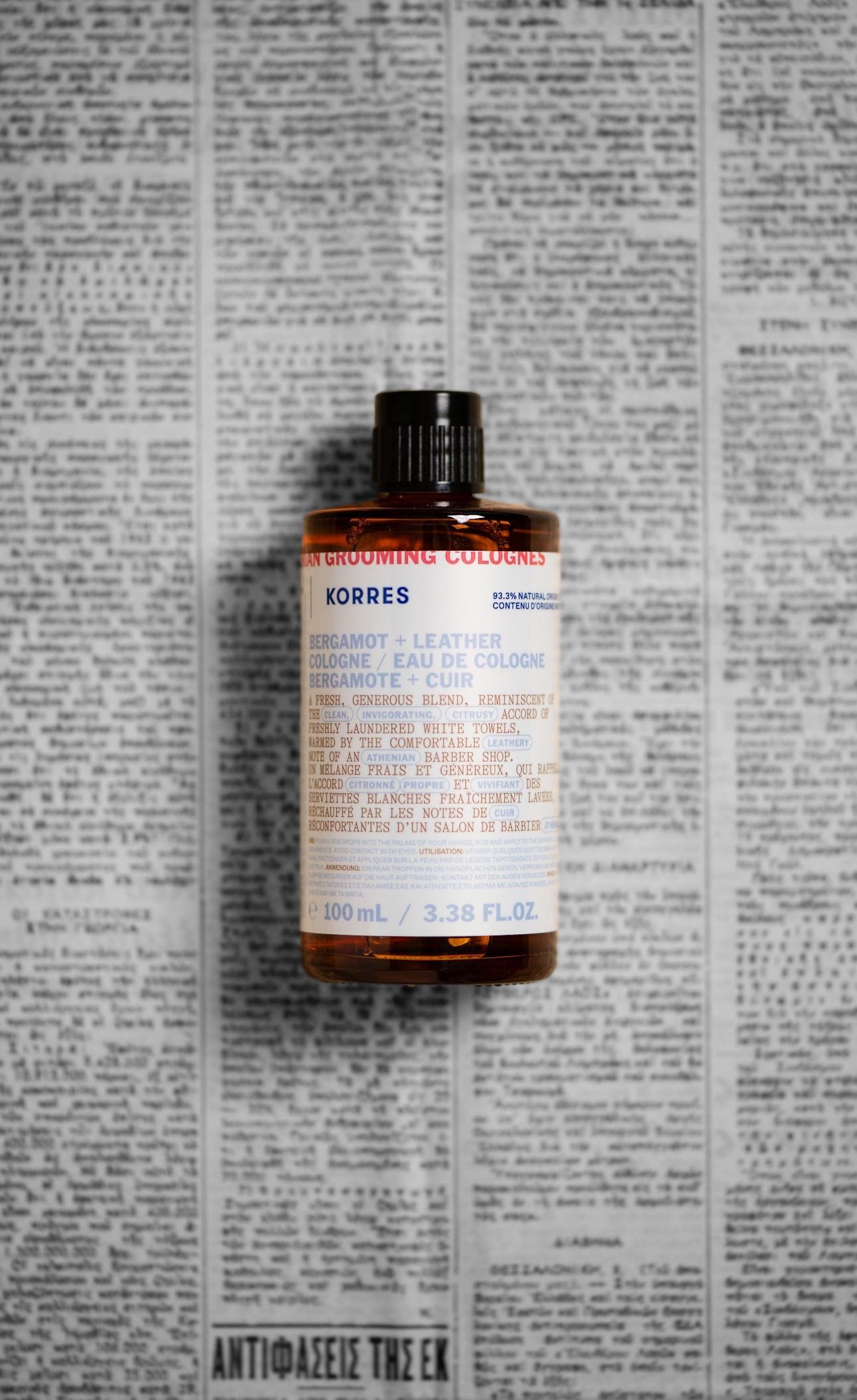 The Bergamot + Leather Eau de Cologne combines the pure, invigorating citrus scent of freshly washed white towels with the warm, comfortable leather note of an Athens barbershop. The Eau de Cologne, in an elegant glass bottle with a practical dispenser for generous use, reflects the classic rituals of the barbers. With 93.3% ingredients of natural origin, it offers a refreshing yet sophisticated scent that reinterprets traditional care.