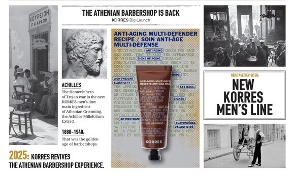 KORRES is giving new life to the authentic tradition of the Athens barbershop and will be presenting an innovative grooming range for men from February 2024. This line includes eight products formulated with the best natural ingredients in the KORRES laboratories. Inspired by the classic techniques and rituals of Athenian barbers, each product provides an unparalleled feeling of well-being and deep revitalization. The collection includes skincare, shaving and fragrance products, including two elegant colognes that capture the charm and sophistication of historic Athens barbershops. Every detail of this line pays homage to the timeless Athens barber experience and the legacy of Greek apothecary art: from the distinctive scents to amber glass bottles to aluminum tubes reminiscent of traditional barbershop equipment. With this collection, KORRES combines the authenticity of ancient care habits with the modern rituals of men – a perfect symbiosis of history and innovation.