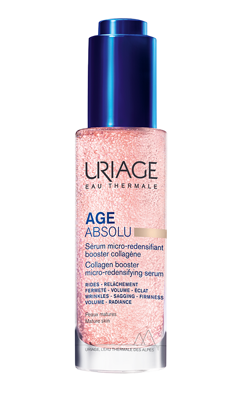The Collagen Booster Micro-Redensifying Serum from URIAGE expands the Age Absolu collection, which already includes the Redensifying Rosy Cream and the Redensifying Sleeping Mask. This supplement completes the entire product line and offers a highly effective anti-aging solution for those who want to tone and smooth their skin. The benefits of this serum are made possible by Uriage’s patented water-to-oil technology. The water-based phase penetrates the skin first, while the oil-based phase only bonds to the skin when the product is massaged in. Since the two phases are not chemically bonded, the skin does not need to separate them, allowing for faster and more thorough penetration. The water-based phase initially gives the skin an incomparable feeling of freshness, followed by the oil-based phase, which intensively nourishes the skin while remaining light and leaving a silky-soft feeling. Another advantage is that the active ingredients can be better absorbed, both in the water-based and oil-based phase.