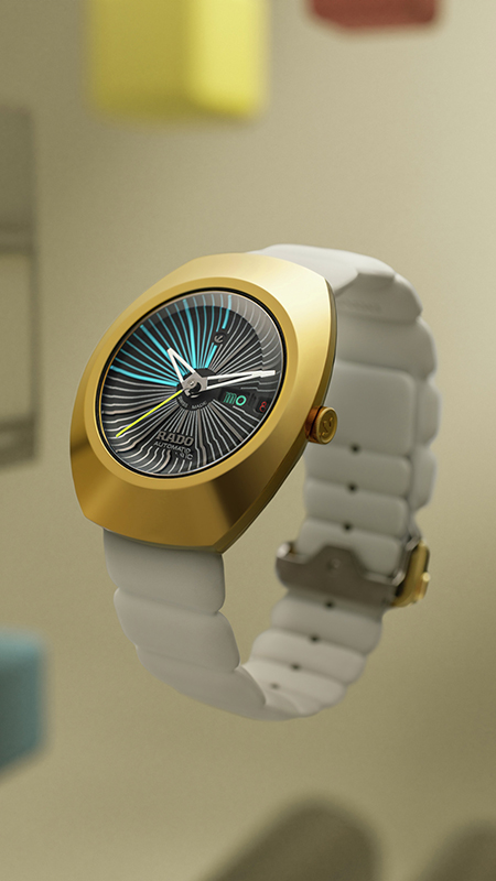 The combination of visionary design codes and characteristic Rado materials will delight lovers of the brand as well as design fans. The sweeping bezel made of gold-colored Ceramos™, the faceted Sapphire crystal and the galvanically refined dial with diamond dust effect testify to Rado’s material expertise. But it is the details into which the visionary incorporates his design messages: the cushion-shaped Rubber strap with hidden engraving on the folding clasp, the minute track in silver and blue and the date in Tej Chauhan’s script in phosphorescent colors. The hour and minute hands in Black gold are coated with white Super-LumiNova® and are accompanied by a bright yellow second hand.