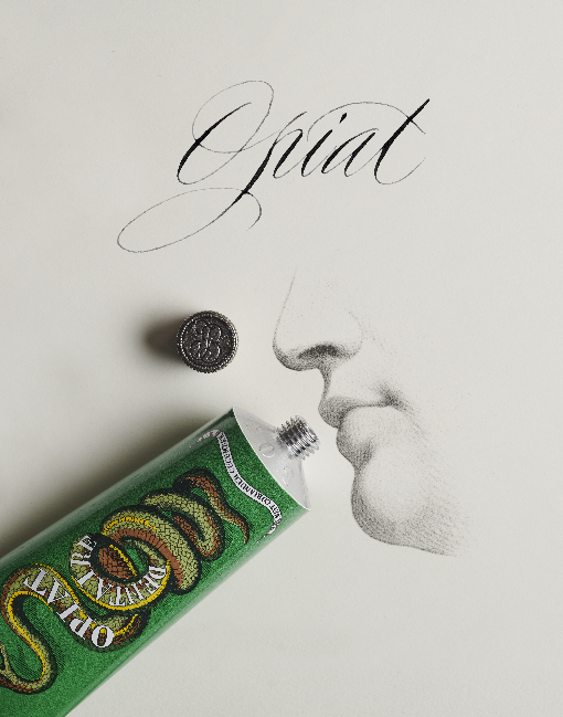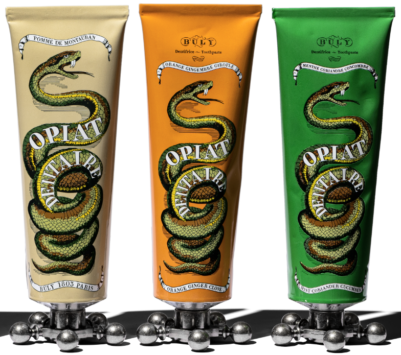 Inspired by the god of healing, Officine has developed a collection of oral and dental care products under the sign of the serpent… and a stunning smile. A magnificent, writhing serpent is emblazoned on each tube of Opiat Dentaire toothpaste and each bottle of Eau de la Belle Haleine mouthwash. As the research of Moroccan artist and creative director Ramdane Touhami shows, the serpent is part of traditional 19th-century iconography. Thus, the serpent biting its tail is a symbol of eternity. While our dental care products cannot last forever, they can be used as often as you like to banish the evil spirits of neglected teeth and unpleasant bad breath. These tubes and bottles contain the paradise of dental care. This is indicated by the shining white teeth of the snake, to whose seductive power Eve succumbed when she accepted the forbidden fruit from it.