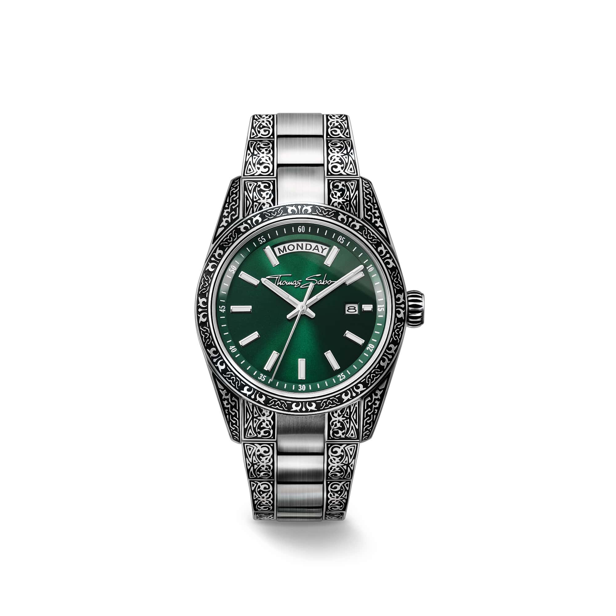 Each model is made from silver-tone stainless steel and features intricately detailed surfaces. Flowing acanthus motifs, crisp lines and symbolically charged patterns – some subtly accentuated in black – span the case, bezel and bracelet. Inspired by historic engraving traditions and vintage design languages, the result is a sculptural, yet wearable object – graphic, pared-down, expressive.