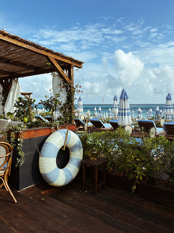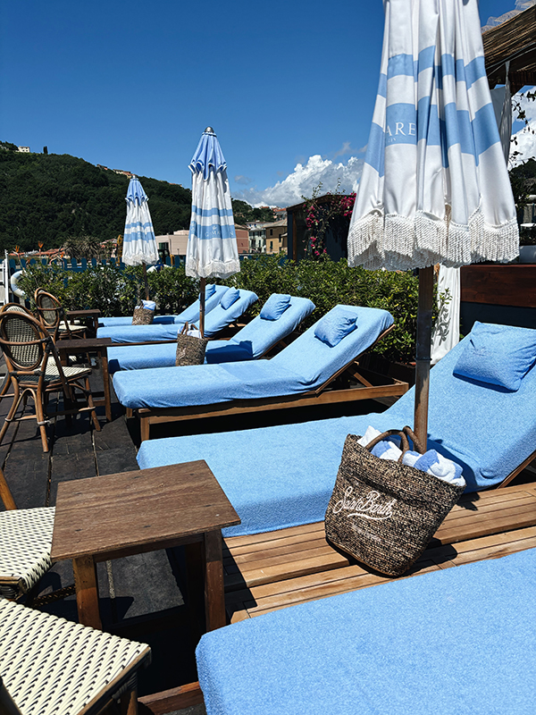 Edoardo Santanna and Mattia Ferrari, creative directors of the beautiful beach club, for this season have chosen for the interior design of their establishment a classy concept typical of the Villa in Riviera: the elegant and predominant tone of navy blue is enriched by retro touches and striped patterns, ranging from powder blue to creamy white, while an evocative garden adorned with jasmine and climbing plants, curated by the flower designer Fiorista Carmen, welcomes guests upon their arrival with an enchanting atmosphere. In the wake of these nuances, clear and elegant in the shades of the sky and sea, the beach area is also dressed in soft, maritime colors, divided into standard and VIP sunbeds for a total of 70 stations available to the guests; comfort and privacy for those who require a more private experience, or the choice of a more dynamic environment for those who prefer the liveliness of a more animated area. For guests, young and old, who would like to have fun or be rocked in the waves on hot days, colorful circular inflatables designed by Petit Pommes are available, chic and Instagrammable.