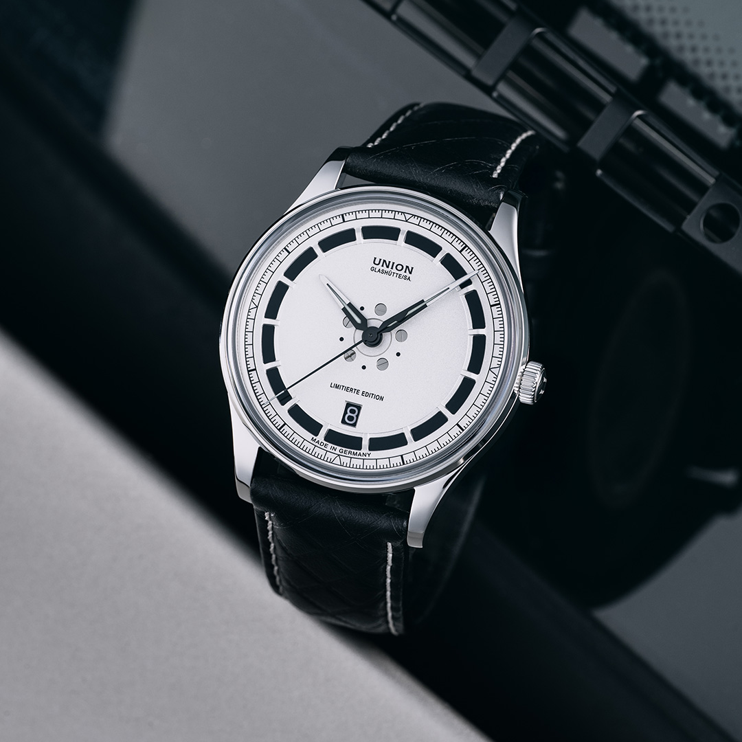 „Gullideckel“ on tour! „Gullideckel“ (manhole cover) was the affectionate nickname given to the smooth-surfaced aluminum rims that were fitted as standard on some car models in the 1980s. UNION GLASHÜTTE drew inspiration from these very rims and, to mark the Deutschland Klassik 2025, is launching a very special watch, the Noramis Date Limited Edition. It features a silver-colored dial with 15 narrow rectangular holes around the edge, giving the watch face the appearance of the legendary „Gullideckel“ rim. The look is completed by five small bolts, reminiscent of wheel nuts, around the eye of the hands.