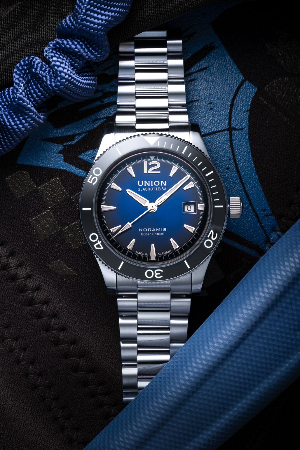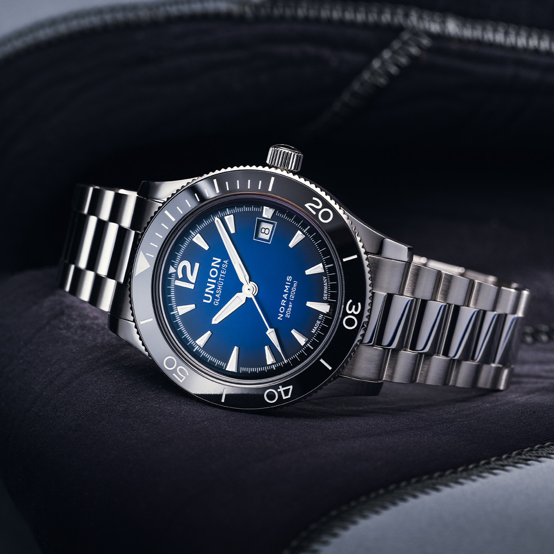 Modern technology in a sporty package. The Noramis Date Sport line from UNION GLASHÜTTE is complemented by a version with a delicate stainless steel bracelet that fits perfectly on the wrist. With a diameter of 42 mm and a date display at 3 o’clock, this timeless watch is the perfect companion for sporting adventures. The blue dégradé dial is a particular eye-catcher: It changes from radiantly light in the center to dark at the outer edge. This spectacle is skillfully showcased by a domed sapphire crystal, a screw-down crown, and a black ceramic bezel, which—as is important for diving watches—can be rotated in one direction.