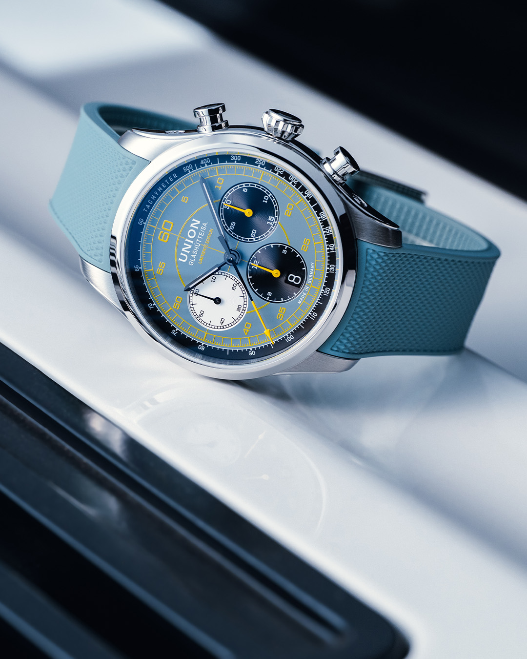 The combination of matte blue-gray and vibrant yellow gives the watch a modern, sporty, yet elegant look. The color choice is deliberately unconventional – it represents dynamism and individuality. Yellow Arabic numerals, a central crosshair, and the tachymeter scale underscore the model’s racing character. The hands are finished in PVD black, creating a striking contrast. Instead of traditional numbering, the dial displays second intervals – a subtle nod to the watch’s stylistic inspiration.