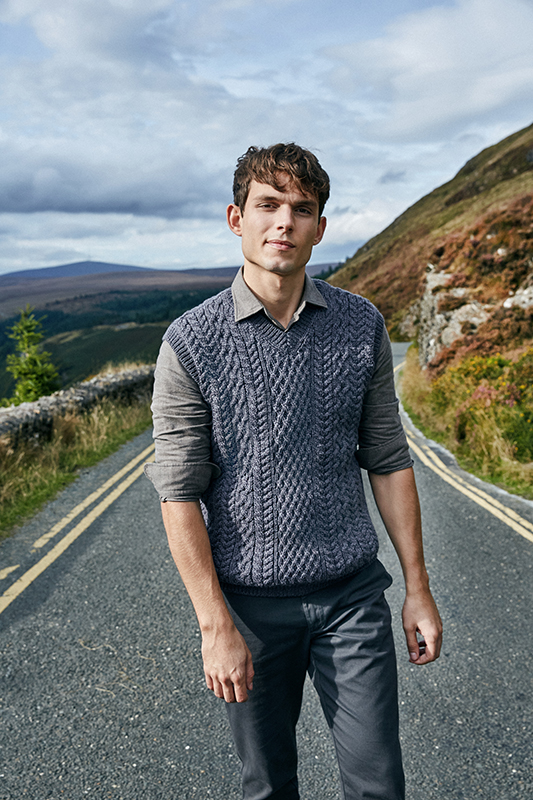 The Aran V-Neck Cardigan brings traditional patterns to a modern, sleeveless silhouette. With a deep V-neck and loose fit, it’s versatile for layering—over shirts, blouses, or light tops. The natural colors give the piece a particularly understated look and emphasize the texture of the classic Aran knit motifs.